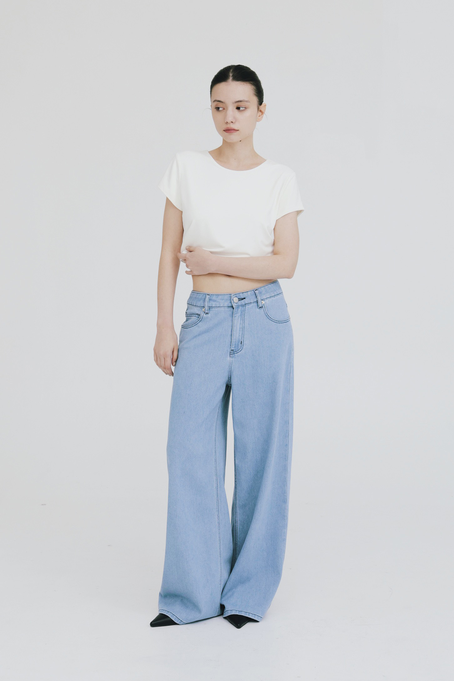 不對稱斜襠落地寬褲(霧灰)